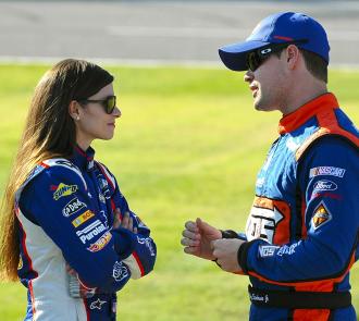 Danica Patrick, left, talks with Ricky Stenhouse Jr., right, as they wait on pit road during qualifying at Texas Motor Speedway Saturday, Nov. 3, 2012. Photo – Randy Holt/AP