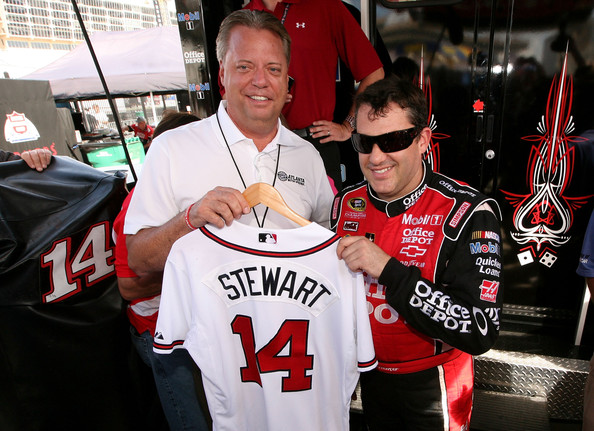 Tony Stewart, driver of the #14 Office Depot/Mobil 1 Chevrolet, receives an Atlanta Braves jersey from Ed Clark (L), President of Atlanta Motor Speedway during practice for the NASCAR Sprint Cup Series Advocare 500 at Atlanta Motor Speedway on August 31, 2012 in Hampton, Georgia.