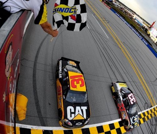 Another example of tandem racing – Clint Bowyer (33) beats drafting partner Jeff Burton (31) to the finish line by .018 seconds to win the Good Sam Club 500 at Talladega Superspeedway. Photo by Jason Smith/Getty Images