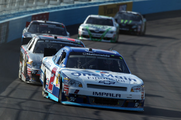 Elliott Sadler, driver of the #2 OneMain Financial Chevrolet, leads a group of cars during the NASCAR Nationwide Series Bashas’ Supermarkets 200 at Phoenix International Raceway on March 3, 2012