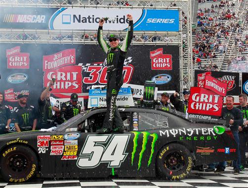 Kyle Busch, driver of the #54 Monster Energy Toyota, celebrates in Victory Lane after winning the NASCAR Nationwide Series Jeff Foxworthy’s Grit Chips 300 at Bristol Motor Speedway on March 16, 2013