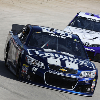 Jimmie Johnson, driver of the #48 Lowe’s Chevrolet, leads Joe Nemechek, driver of the #87 MaddiesPlaceRocks.com Toyota, during the NASCAR Sprint Cup Series STP Gas Booster 500 on April 7, 2013 at Martinsville Speedway