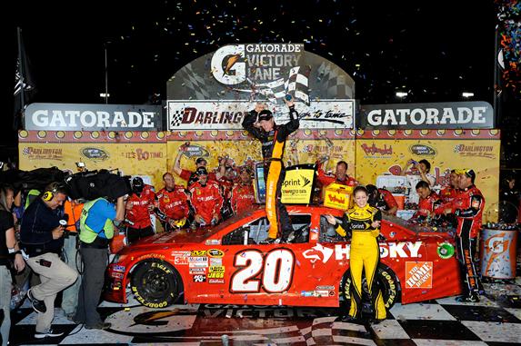 Matt Kenseth, driver of the #20 The Home Depot / Husky Toyota, celebrates with his crew in victory lane after winning the NASCAR Sprint Cup Series Bojangles’ Southern 500 at Darlington Raceway on May 11, 2013