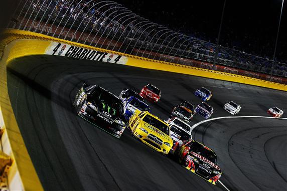 Going three-wide, Kurt Busch, driver of the No. 51 Phoenix Construction Services Chevrolet, races AJ Allmendinger, driver of the No. 22 Pennzoil Dodge, and Jeff Gordon, driver of the No. 24 DuPont Chevrolet, during the NASCAR Sprint All-Star Race at Charlotte Motor Speedway, May 19, 2012