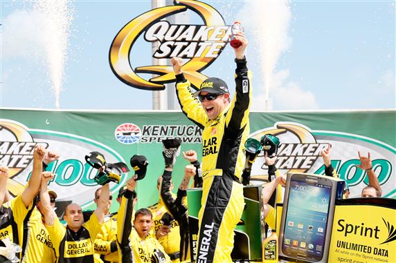 Matt Kenseth, driver of the #20 Dollar General Toyota, celebrates in Victory Lane after winning the NASCAR Sprint Cup Series Quaker State 400 at Kentucky Speedway on June 30, 2013