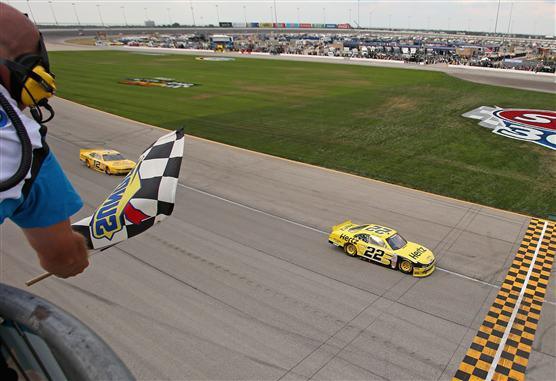 Joey Logano Wins STP 300 at Chicagoland with teammate Sam Hornish Jr. finishing second.