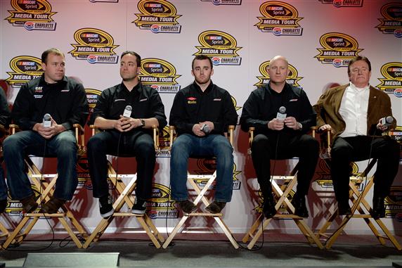 (L-R) Ryan Newman, driver of the #31 Caterpillar/Quicken Loans Chevrolet; Paul Menard, driver of the #27 Menard’s Chevrolet; Austin Dillon, driver of the #3 DOW/Cheerios Chevrolet; Eric Warren, director of competition for Richard Childress Racing; and Richard Childress, owner of Richard Childress Racing speak with the media during the NASCAR Sprint Media Tour at Charlotte Convention Center on January 28, 2014