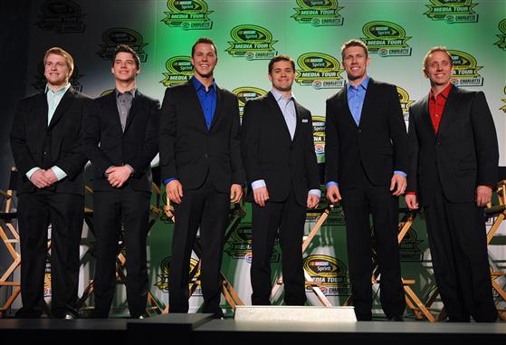 (L-R) Chris Buescher, driver of the No. 60 Ford EcoBoost Ford, Ryan Reed, driver of the No. 16 American Diabetes Drive to Stop Diabetes presented by Lilly Diabetes Ford, Trevor Bayne, driver of the No. 6 Advocare Ford, Ricky Stenhouse Jr., driver of the No. 17 Nationwide Ford, Carl Edwards, driver of the No. 99 Fastenal Ford, and Greg Biffle, driver of the No. 16 3M Ford, pose for the media during the NASCAR Sprint Media Tour at Charlotte Convention Center on January 29, 2014