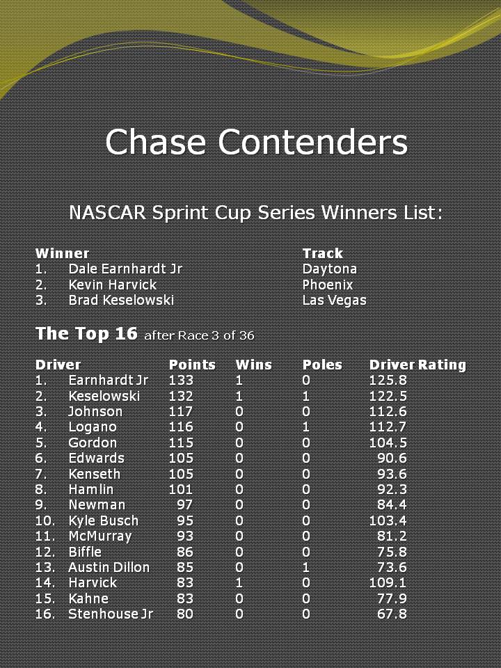 - The race winner has started from the pole 22 times, the most productive starting position. The last driver to win from the pole was Carl Edwards, in the night race of 2008.