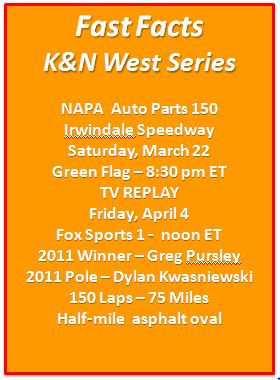 The NAPA Auto Parts 150 will be Race No. 2 on the 2014 schedule for the K&N West, which opened on Feb. 27 at Phoenix International Raceway. Greg Pursley was victorious in the West’s last trip to Irwindale in 2011.