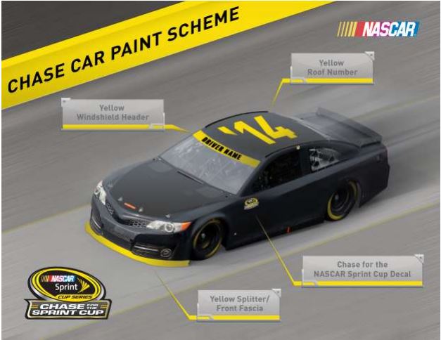 Chase for the NASCAR Sprint Cup-eligible cars will have the roof number, the front splitter / front fascia and the windshield header colored yellow, as well as have a Chase for the NASCAR Sprint Cup logo affixed to the front-quarter panel of their race car.