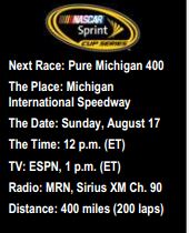 Ryan Newman: Newman plummeted to ninth in the points standings thanks to an accident at Watkins Glen, but a race at Michigan could cure those ills. A two-time winner at MIS, Newman won back-to-back events in 2003-04.