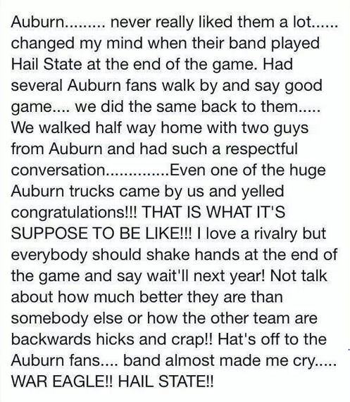 Most of us would agree ‘That is what it’s suppose to be like!’ Kudos to those Auburn fans and their band for the reminder. You deserve a standing ovation and I for one, also applaud the Mississippi fan that took the time to share their ‘wow’ moments of good sportsmanship and respect from their rival.