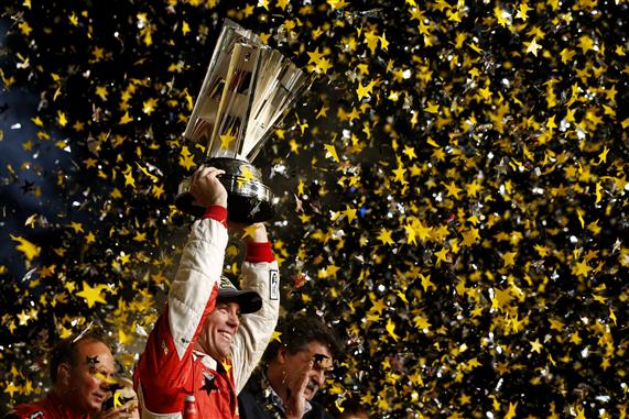 Kevin Harvick, driver of the #4 Budweiser Chevrolet, celebrates with the trophy in Victory Lane after winning the NASCAR Sprint Cup Series Ford EcoBoost 400 at Homestead-Miami Speedway on November 16, 2014 in Homestead, Florida. Photo – Sean Gardner/Getty Images