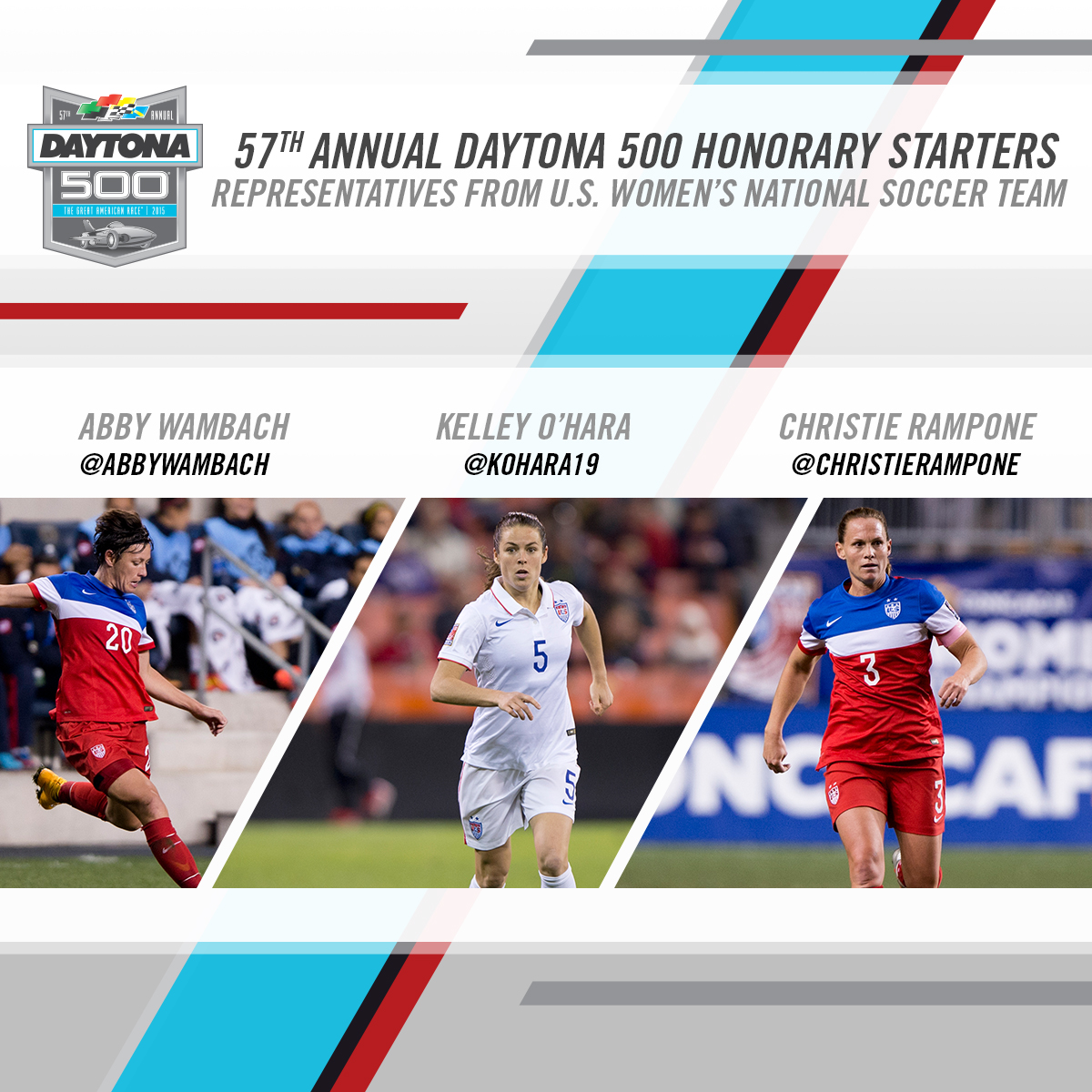 Abby Wambach, Kelley O’Hara and Christie Rampone will represent the U. S. Women’s National Soccer Team as the Honorary Starters of the 57th annual DAYTONA 500 NASCAR Sprint Cup Series race on Sunday, Feb. 22 at 1 p.m. at Daytona International Speedway (TV – FOX, FOX Deportes; Radio – MRN Radio, SiriusXM).