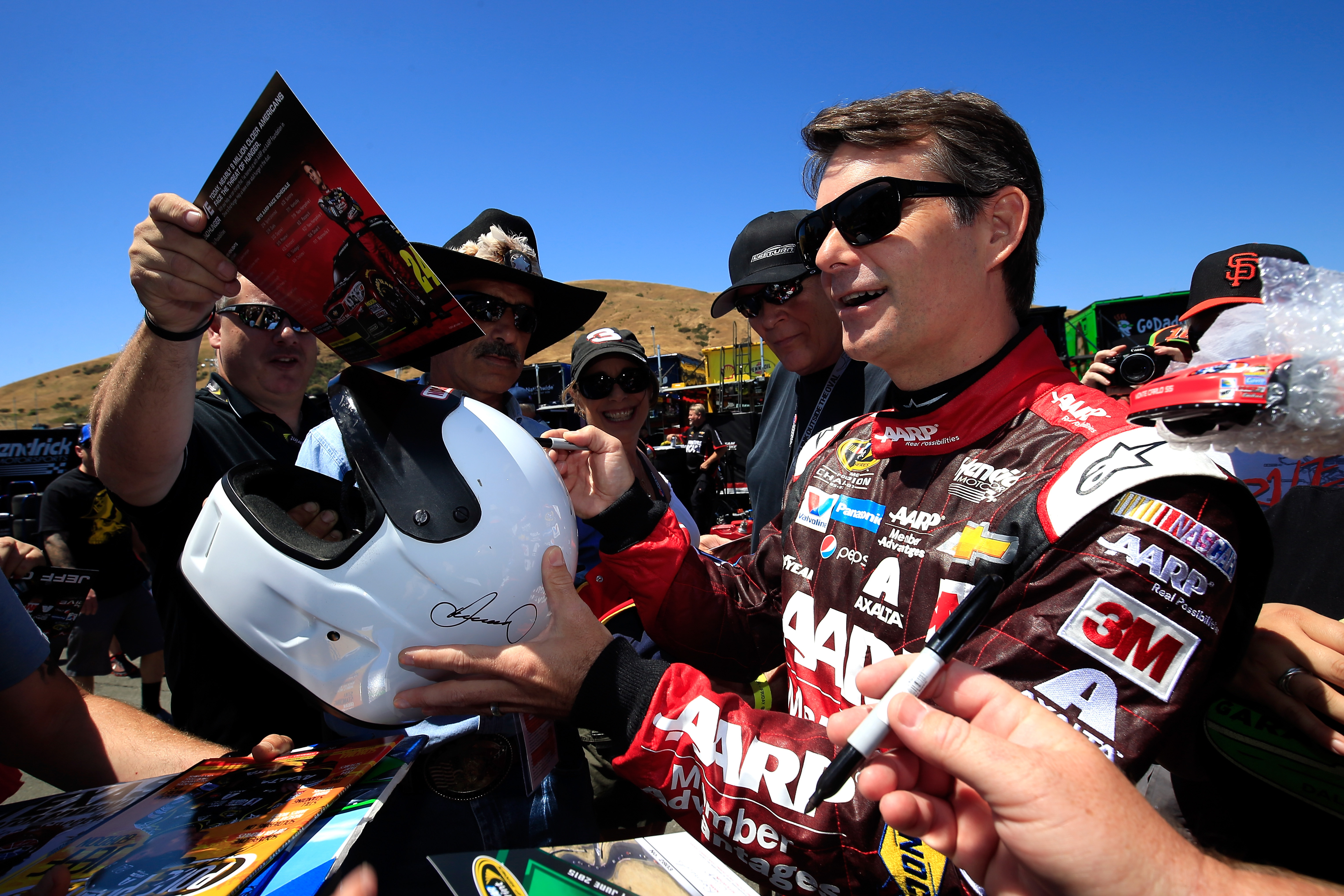 SONOMA, CA – JUNE 26: Jeff Gordon, driver of the #24 AARP Member Advantages Chevrolet, signs autographs for fans during practice for the NASCAR Sprint Cup Series Toyota/Save Mart 350 at Sonoma Raceway on June 26, 2015 in Sonoma, California. Photo – Chris Trotman/Getty Images