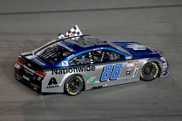 Dale Earnhardt Jr., driver of the #88 Nationwide Chevrolet, called ‘Amelia,’ celebrates after winning the NASCAR Sprint Cup Series Can-Am Duels at Daytona International Speedway on February 18, 2016