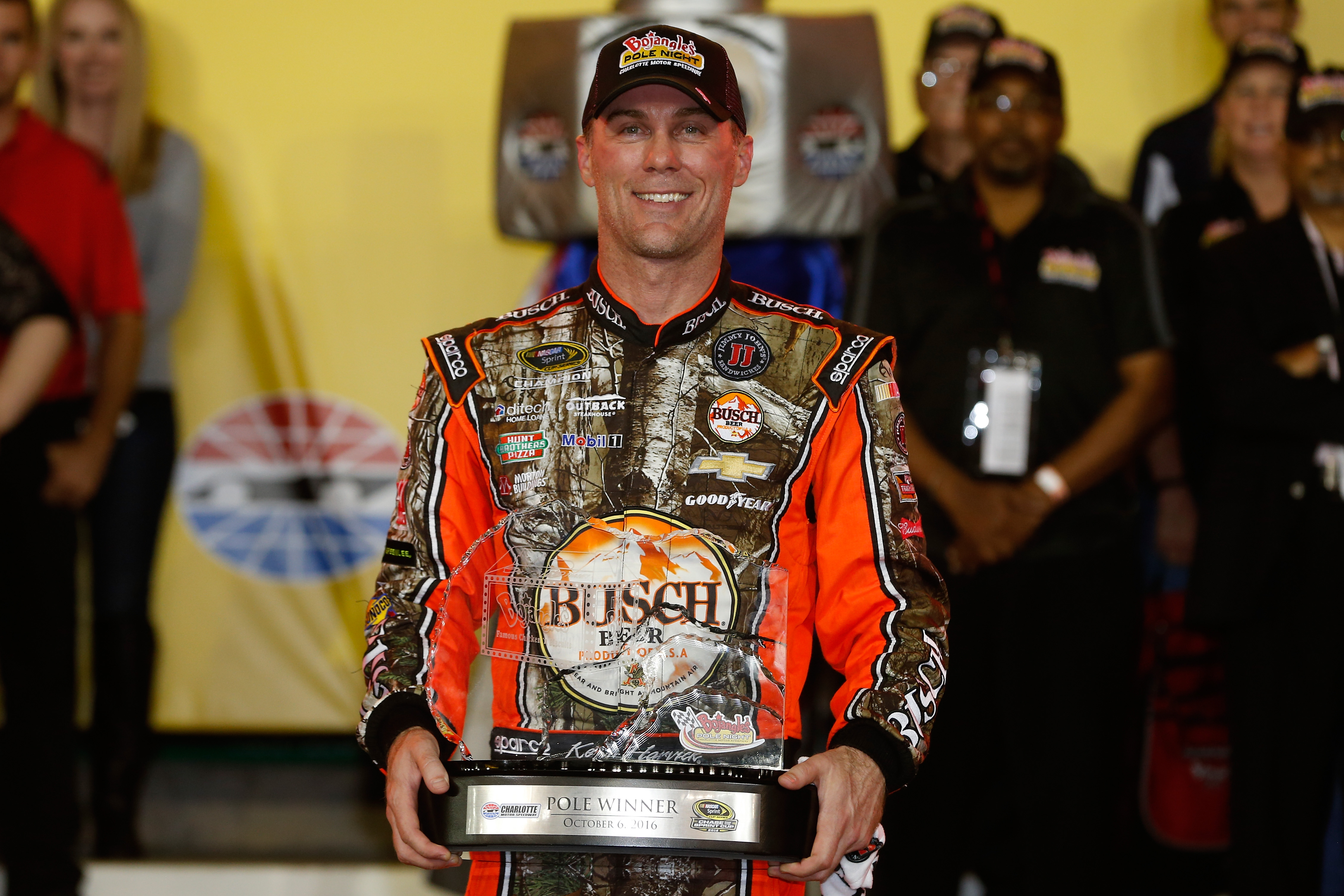 CHARLOTTE, NC – OCTOBER 06: Kevin Harvick, driver of the #4 Busch Hunting Chevrolet, poses with a trophy after winning the pole position during qualifying for the NASCAR Sprint Cup Series Bank of America 500 at Charlotte Motor Speedway on October 6, 2016 in Charlotte, North Carolina.
