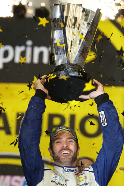 Jimmie Johnson, driver of the #48 Lowe’s Chevrolet, celebrates with the NASCAR Sprint Cup Series Championship trophy in Victory Lane after winning the NASCAR Sprint Cup Series Ford EcoBoost 400 and the 2016 NASCAR Sprint Cup Series Championship at Homestead-Miami Speedway on November 20, 2016 in Homestead, Florida. Johnson wins a record-tying 7th NASCAR title. Photo – Sarah Crabill/Getty Images