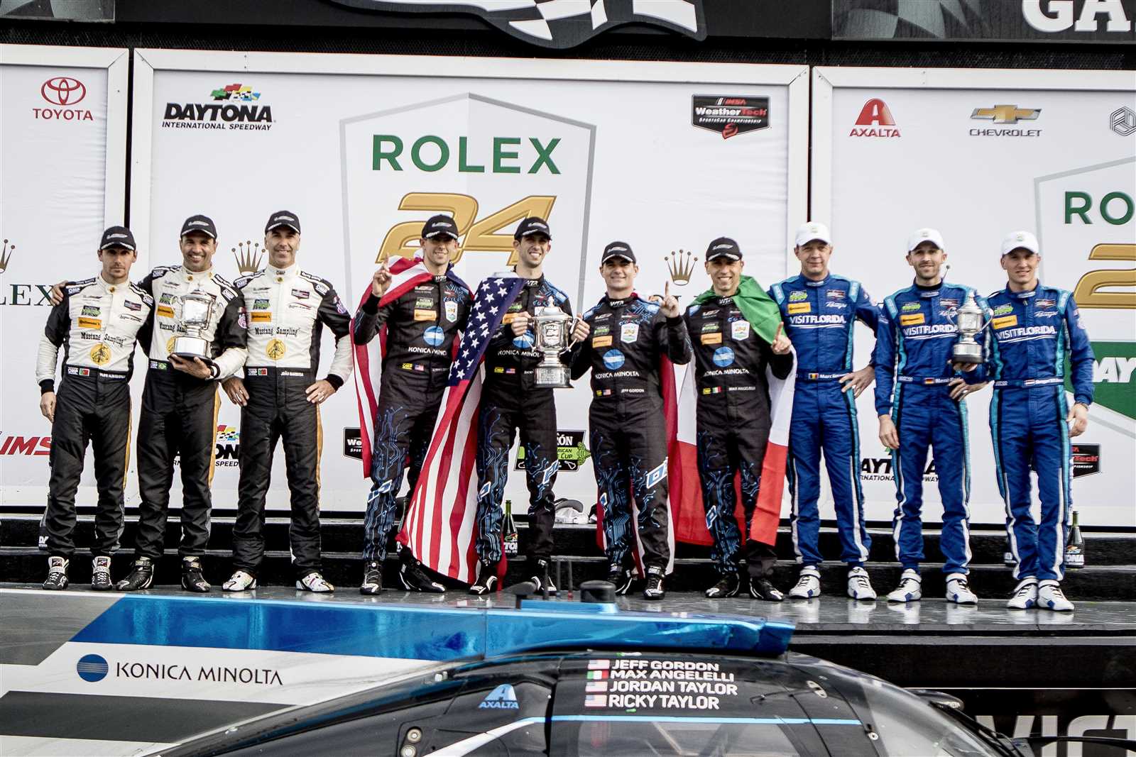 (L-R) Filiepe Albuquerque, Christian Fittipaldi, Joao Barbosa, Jordan Taylor, Ricky Tayor, Jeff Gordon , Max Angelelli, Marc Goosens, Rene Rast and Renger van der Zande stand on the winners’ podium after the Rolex 24 at Daytona International Speedway.
