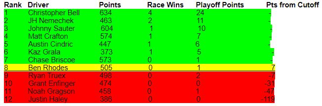 The following drivers could clinch their Playoffs berth with a win or on points based on a repeat winner and help from other drivers: