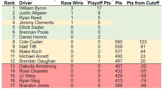 Though Jeremy Clements has a win, he has not yet clinched a Playoffs spot because he hasn’t clinched a top-20 spot in the standings. Clements is currently 18th in the standings, 101 points ahead of 21st, and can still possibly fall out of top-20 in the next two races. If Clements was to fall out of the top-20 in the standings, even though he has a win, he would be ineligible for the postseason. Clements can lock himself into the top-20 and the playoffs with 17 points this weekend.
