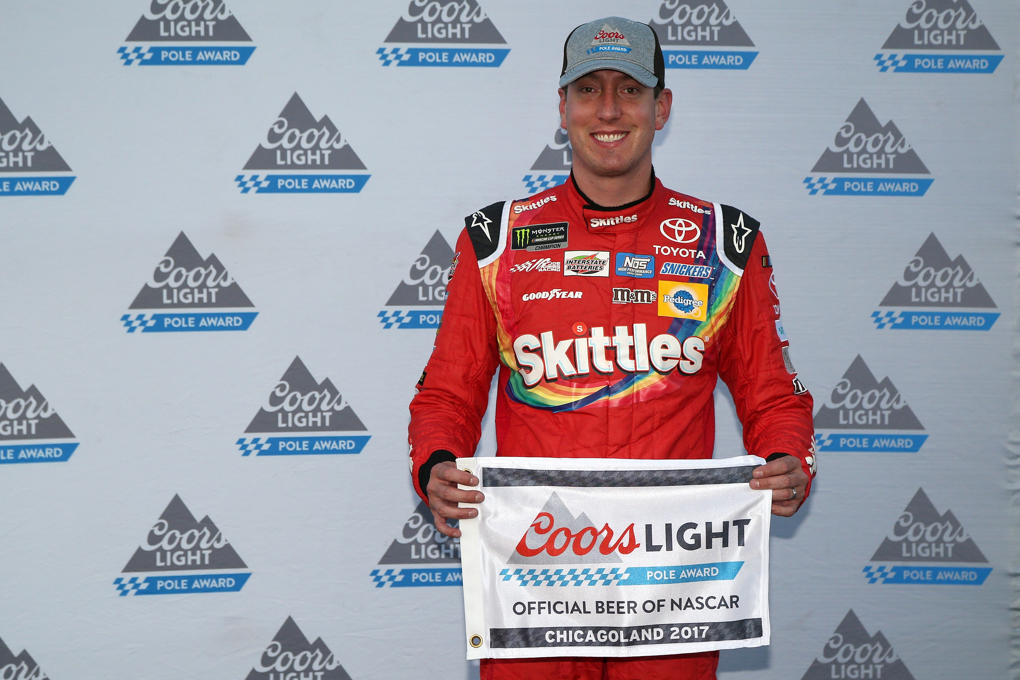 JOLIET, IL – SEPTEMBER 15: Kyle Busch, driver of the #18 Skittles Sweet Heat Toyota, poses with the Coors Light Pole Award after qualifying in the pole position for the Monster Energy NASCAR Cup Series Tales of the Turtles 400 at Chicagoland Speedway on September 15, 2017, in Joliet, Illinois. Photo by Sean Gardner/Getty Images