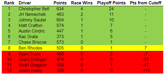 Right now, Ben Rhodes holds the final points position. He’s seven points ahead of Ryan Truex and 31 markers above Grant Enfinger.