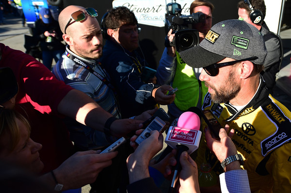 Matt Kenseth, the driver of the #20 DeWalt Flexvolt Toyota, talks to the media after being disqualified during the Monster Energy NASCAR Cup Series Hollywood Casino 400 at Kansas Speedway on October 22, 2017, in Kansas City, Kansas. Photo – Jared C Tilton/Getty Images