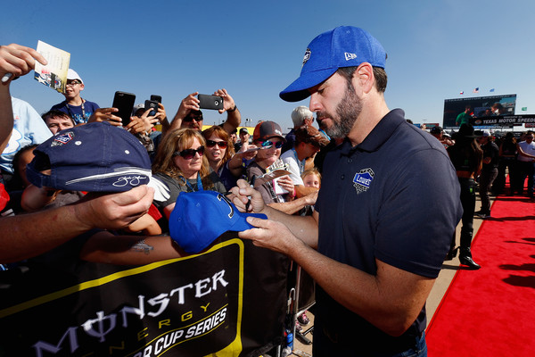 Jimmie Johnson, the driver of the #48 Lowe’s Chevrolet, signs autographs for fans before the Driver/Crew Chief Meeting prior to the Monster Energy NASCAR Cup Series AAA Texas 500 at Texas Motor Speedway on November 5, 2017, in Fort Worth, Texas. Photo – Jonathan Ferrey/Getty Images
