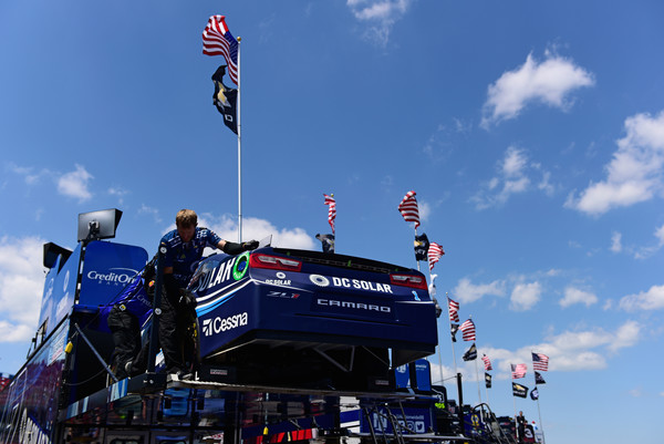 Crew members unload the backup car for Jamie McMurray, driver of the #1 DC Solar Chevrolet, after an on track incident during practice for the Monster Energy NASCAR Cup Series GEICO 500 at Talladega Superspeedway on April 27, 2018, in Talladega, Alabama. Photo – Jared C Tilton/Getty Images