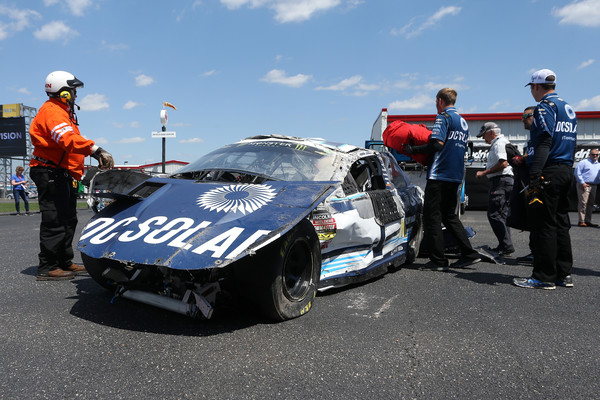 Crew members and NASCAR officials work on the car of Jamie McMurray, driver of the #1 DC Solar Chevrolet, after an on track incident during practice for the Monster Energy NASCAR Cup Series GEICO 500 at Talladega Superspeedway on April 27, 2018, in Talladega, Alabama. Photo – Brian Lawdermilk/Getty Images