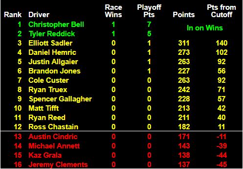 Bell and Reddick are the only two championship contenders with wins virtually locking themselves into the postseason. The other ten drivers are currently forecasted to make the Playoffs by points.