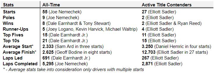 - Average Finish: (top-Five) – Elliott Sadler (3.3), Justin Allgaier (5.0), Matt Tifft (7.0), Michael Annett (7.0), JJ Yeley (12.3).