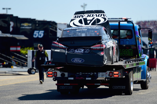 The car of Trevor Bayne, the driver of the #6 AdvoCare Ford, is towed through the garage after an incident during the Monster Energy NASCAR Cup Series GEICO 500 at Talladega Superspeedway on April 29, 2018, in Talladega, Alabama. Photo – Jared C. Tilton/Getty Images