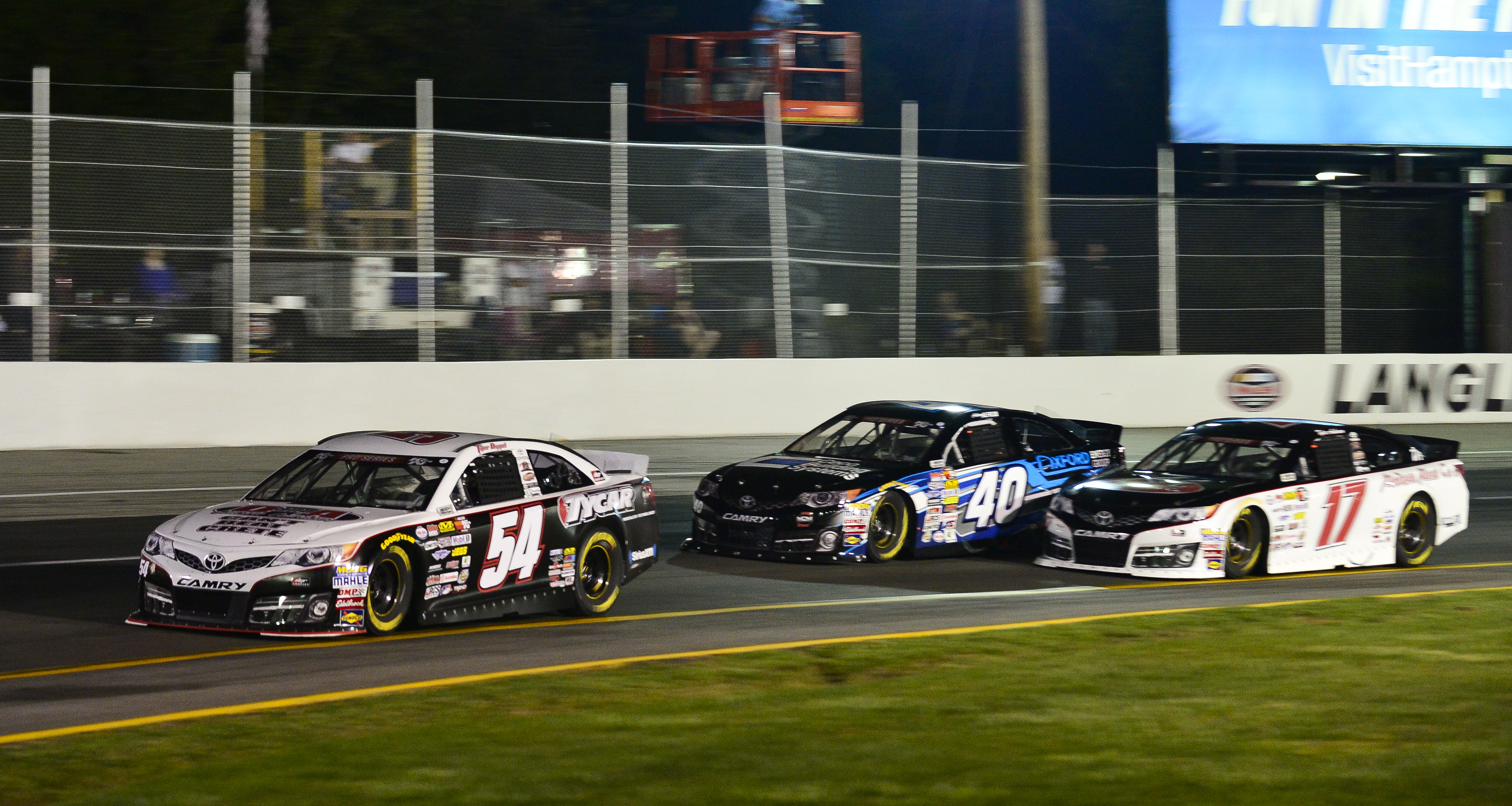 Tyler Dippel (left) holds off Anthony Alfredo (middle) and Tyler Ankrum (right) in the closing laps en route to his Visit Hampton VA 150 NASCAR K&N Pro Series East win Saturday night at Langley Speedway. Photo – Logan Whitton/NKP
