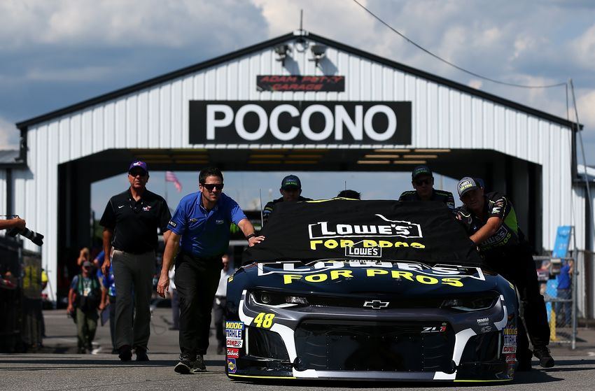 Crew members push the #48 Lowe’s for Pros Chevrolet to the grid during qualifying for the Monster Energy NASCAR Cup Series Gander Outdoors 400 at Pocono Raceway on July 28, 2018, in Long Pond, Pennsylvania. Photo – Sarah Crabill/Getty Images