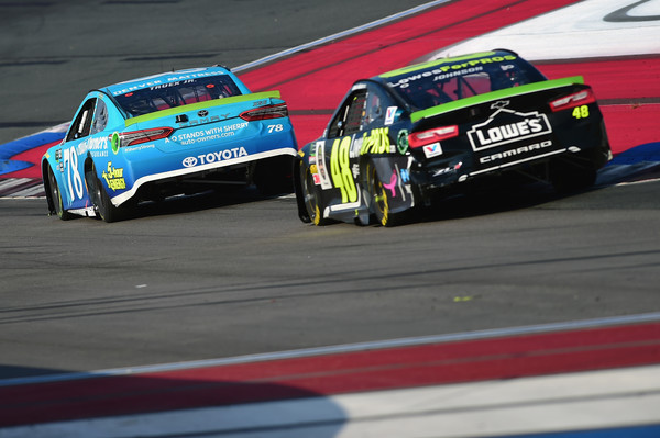 Jimmie Johnson, the driver of the #48 Lowe’s for Pros Chevrolet, races Martin Truex Jr., driver of the #78 Auto-Owners Insurance Toyota, during the Monster Energy NASCAR Cup Series Bank of America Roval 400 at Charlotte Motor Speedway on September 30, 2018, in Charlotte, North Carolina. Photo – Jared C Tilton/Getty Images