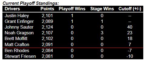 Six of the eight Playoff drivers will advance to the next round of the Playoffs following Saturday’s race.