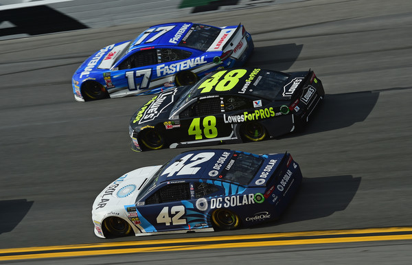 Jimmie Johnson, driver of the #48 Lowe’s for Pros Chevrolet, Kyle Larson, driver of the #42 DC Solar Chevrolet, and Ricky Stenhouse Jr., driver of the #17 Fastenal Ford, race during the Monster Energy NASCAR Cup Series Advance Auto Parts Clash at Daytona International Speedway on February 11, 2018 in Daytona Beach, Florida. Photo – Jared C Tilton/Getty Images
