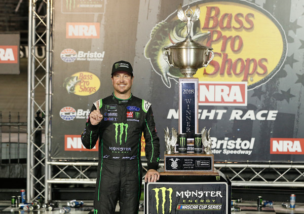 Kurt Busch, the driver of the #41 Monster Energy/Haas Automation Ford, takes the checkered flag to win the Monster Energy NASCAR Cup Series Bass Pro Shops NRA Night Race at Bristol Motor Speedway on August 18, 2018, in Bristol, Tennessee. Photo – Sean Gardner/Getty Images