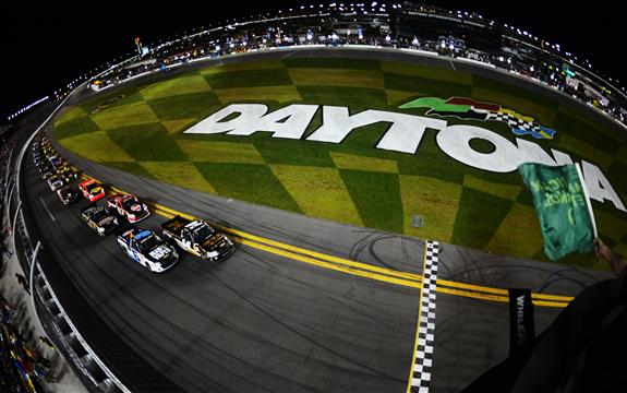 Brennan Newberry, driver of the #14 Fight For Life Chevrolet, leads the pack at the start of the NASCAR Camping World Truck Series NextEra Energy Resources 250 at Daytona International Speedway on February 22, 2013