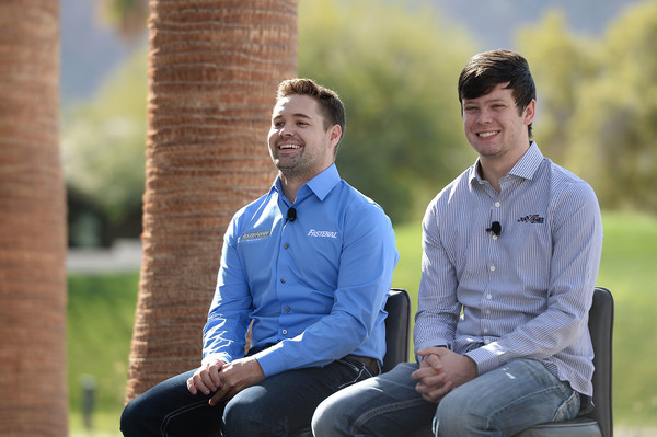 Ricky Stenhouse Jr., driver of the No. 17 Fastenal Ford Fusion for Roush Fenway Racing and Erik Jones, driver of the No. 20 DeWalt Toyota Camry for Joe Gibbs Racing, (R) laugh during a panel discussion during the NASCAR West Coast Media Day at Mountain Shadows Resort on January 26, 2018 in Paradise Valley, Arizona. Photo – Jennifer Stewart/Getty Images