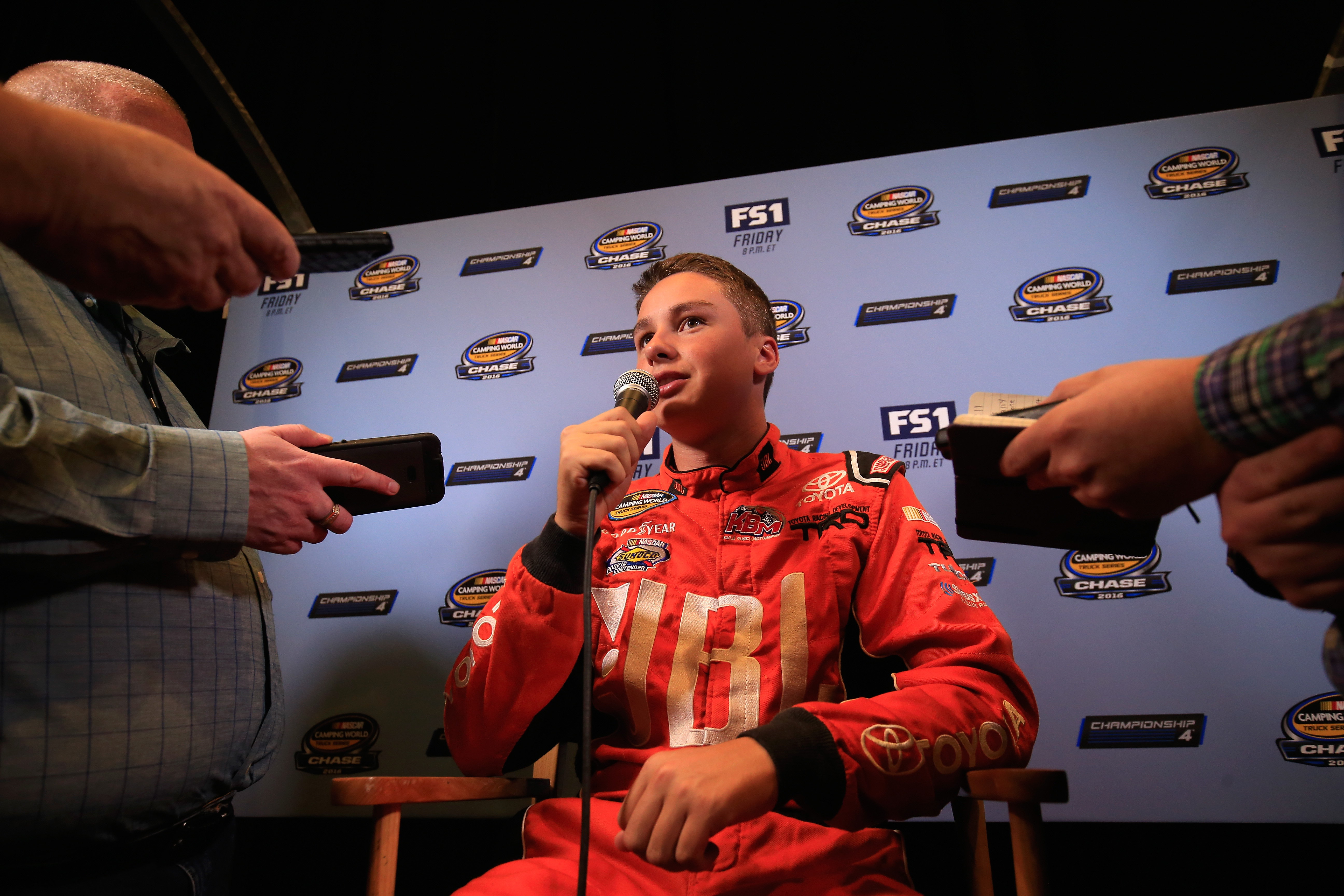 MIAMI BEACH, FL – NOVEMBER 17: Christopher Bell, driver of the #4 JBL Toyota, talks to the media during media day for the NASCAR Camping World Truck Series Championship at the Loews Hotel on November 17, 2016 in Miami Beach, Florida. Photo by Chris Trotman/Getty Images
