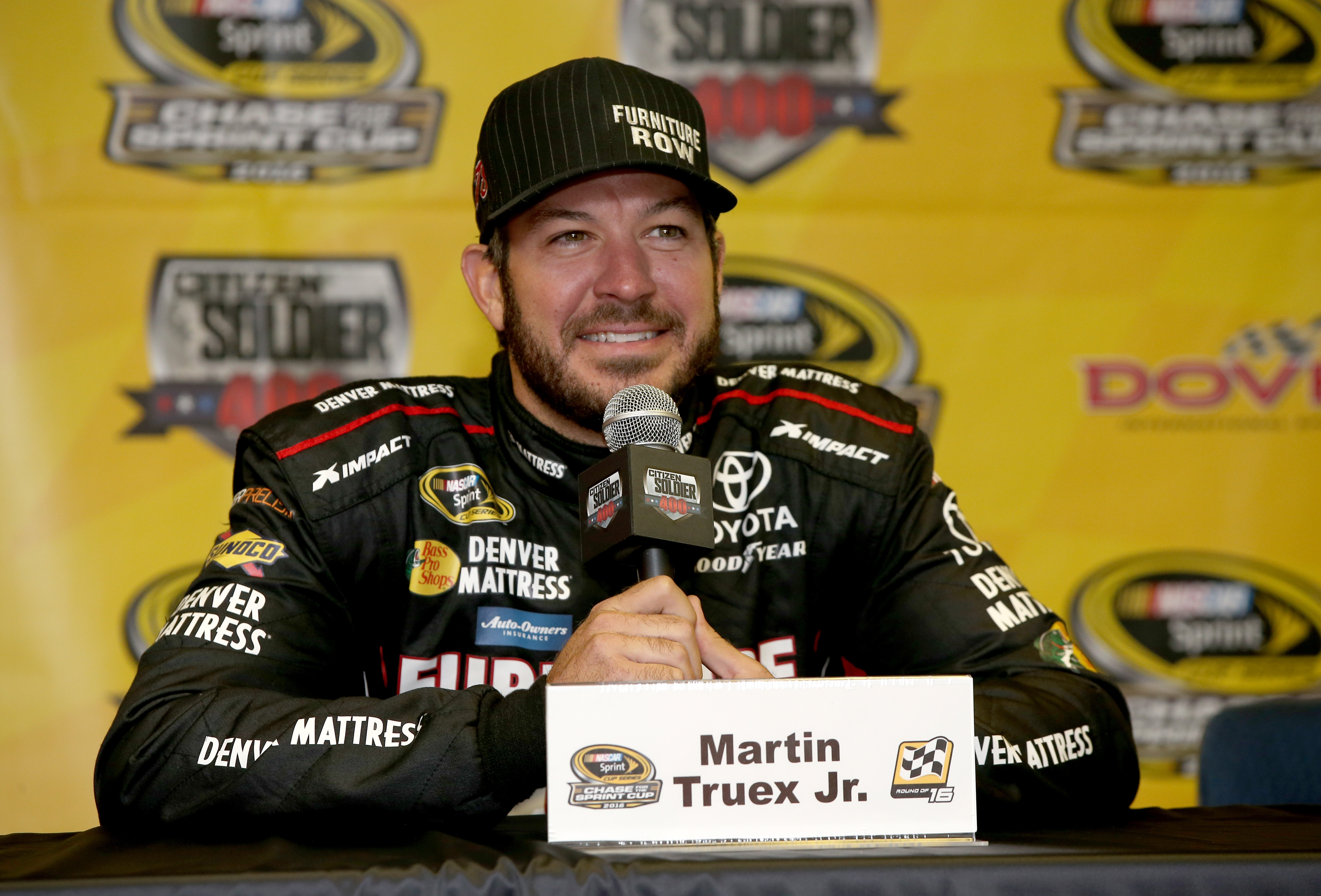 Martin Truex Jr., driver of the #78 Furniture Row/Denver Mattress Toyota, speaks with the media after practice for the NASCAR Sprint Cup Series Citizen Solider 400 at Dover International Speedway on September 30, 2016 in Dover, Delaware. Photo – Sean Gardner/Getty Images