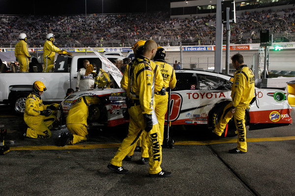 Matt Kenseth, the driver of the #20 Hurricane Harvey Relief Toyota, has his car worked on after a crash during the Monster Energy NASCAR Cup Series Federated Auto Parts 400 at Richmond Raceway on September 9, 2017, in Richmond, Virginia. Photo – Brian Lawdermilk/Getty Images