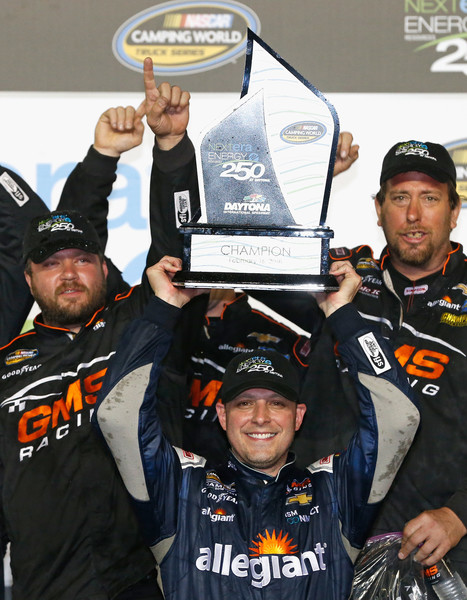 Johnny Sauter, the driver of the #21 Allegiant Airlines Chevrolet, celebrates with the trophy in Victory Lane after winning the NASCAR Camping World Truck Series NextEra Energy Resources 250 at Daytona International Speedway on February 16, 2018, in Daytona Beach, Florida. Photo – Brian Lawdermilk/Getty Images
