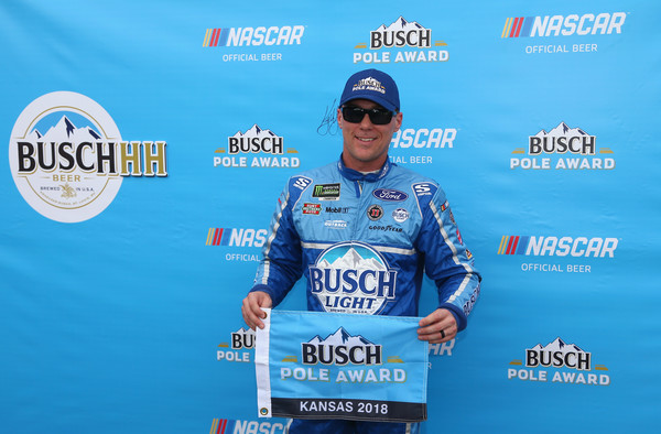 Kevin Harvick, the driver of the #4 Busch Light Ford, takes the checkered flag to win the Monster Energy NASCAR Cup Series KC Masterpiece 400 at Kansas Speedway on May 12, 2018, in Kansas City, Kansas. Photo – Sean Gardner/Getty Images