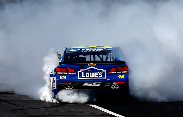 Jimmie Johnson, driver of the #48 Lowe’s Chevrolet, celebrates with a burnout after winning the Monster Energy NASCAR Cup Series O’Reilly Auto Parts 500 at Texas Motor Speedway on April 9, 2017 in Fort Worth, Texas. Photo – Sean Gardner/Getty Images
