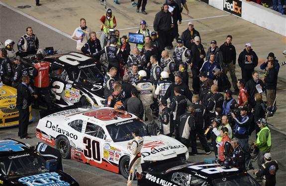 Crews crowd around the Nelson Piquet Jr., driver of the #30 Delavaco Chevrolet, and Brian Scott, driver of the #2 Shore Lodge Chevrolet, cars after the two drivers argued after the NASCAR Nationwide Series ToyotaCare 250 at Richmond International Raceway on April 26, 2013